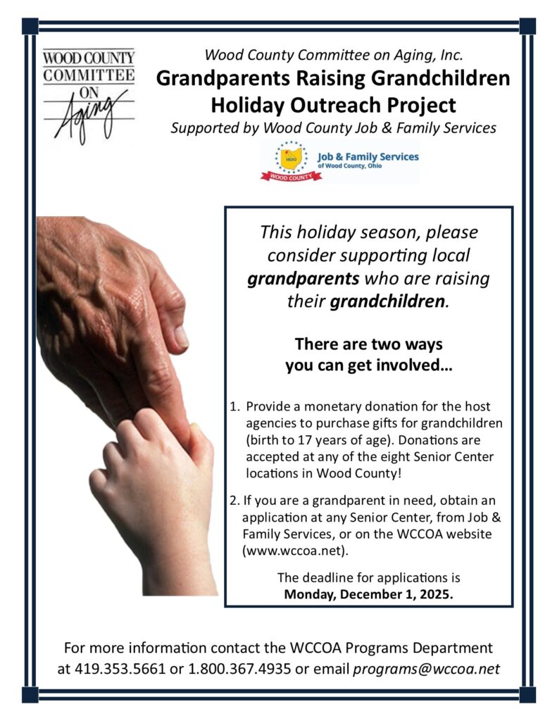 The mission of the Wood County Committee on Aging, Inc., shall be to provide older adults with services and programs which empower them to remain independent and improve the quality of their lives.